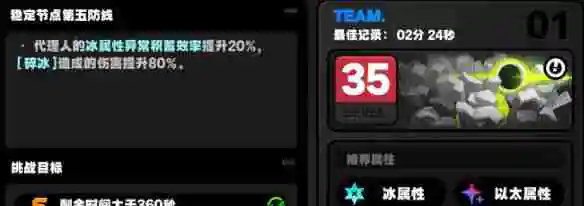效果为:代理人的冰属性异常积蓄效率提升20%,[碎冰]的伤害提升80%,此时我们只需要练一个队伍,可以配队为一击破一辅助;{如防护,异常,支援等}一强攻,击破四星可以用安比,五星可以选择珂蕾妲,莱卡恩;