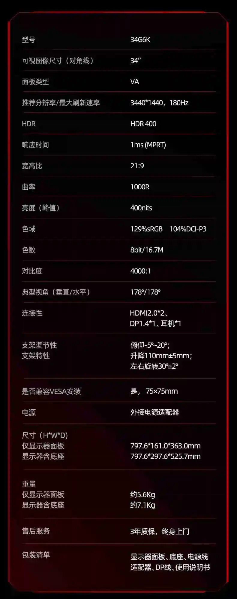3440×1440 分辨率,21:9 旋转升降。