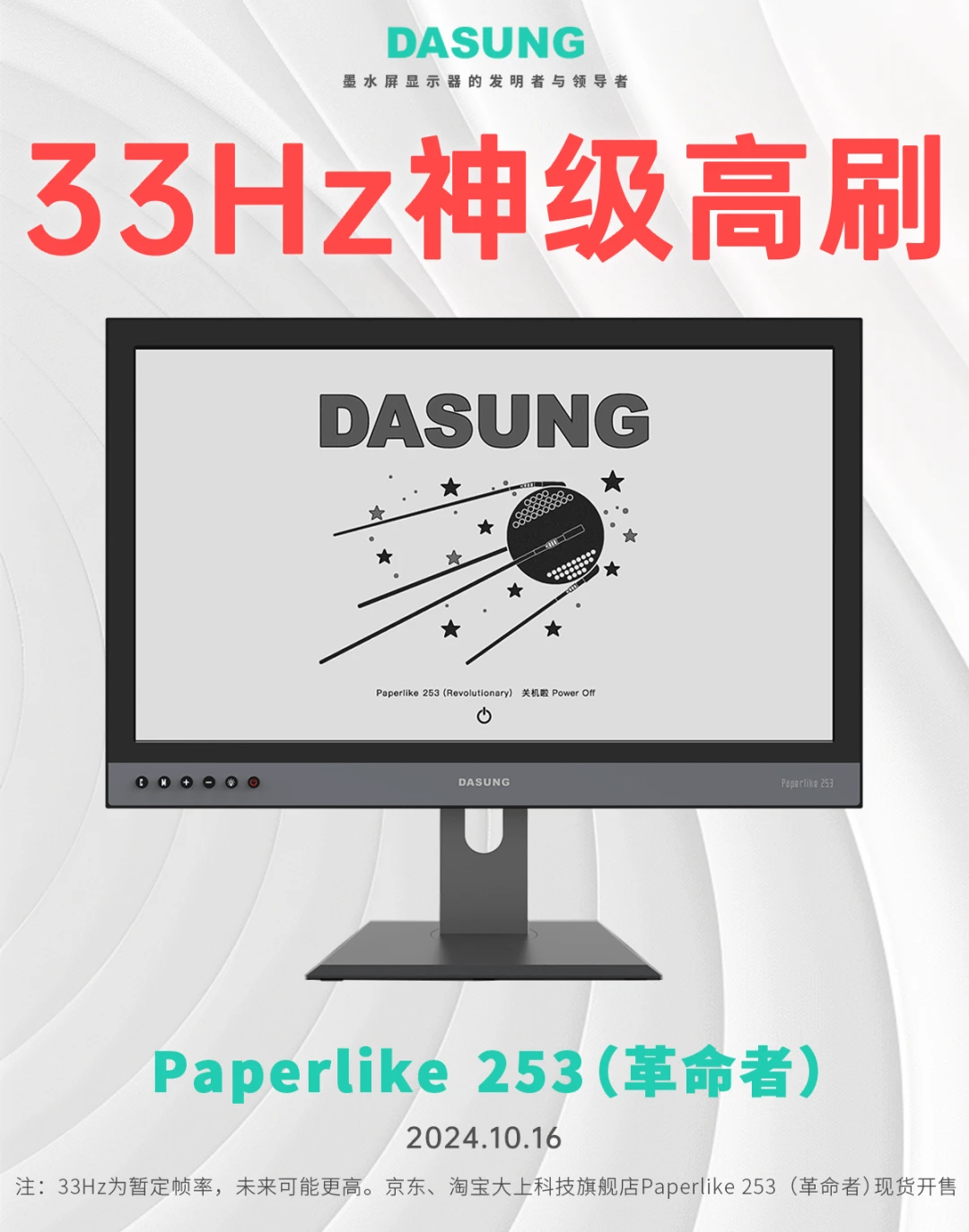 本站 10 月 16 日消息,大上科技今日发布了 paperlike 253(革命者)墨水屏显示器,将屏幕刷新率提升至33hz,售价 8499 元起。