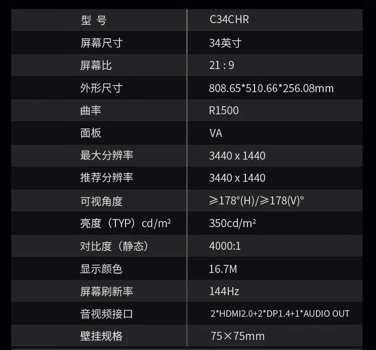 泰坦军团 c34chr 电竞带鱼屏(34 英寸),144hz 高刷 + wqhd 广色域 + hdr400+1500r 曲面屏,日常售价 1199 元。