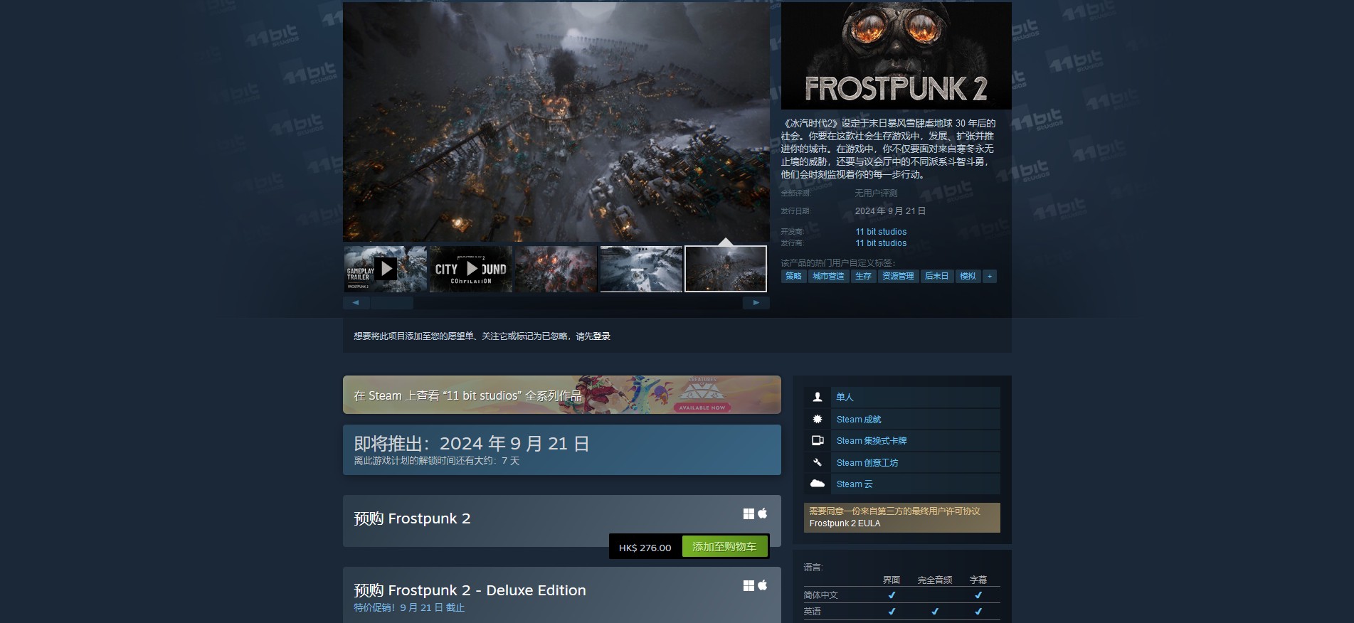 《冰汽时代2(Frostpunk 2)》多个版本的上线时间为2024 年 9 月 21 日上午10点,预载时间大概是前一天,不过也没有必要,游戏比较小。