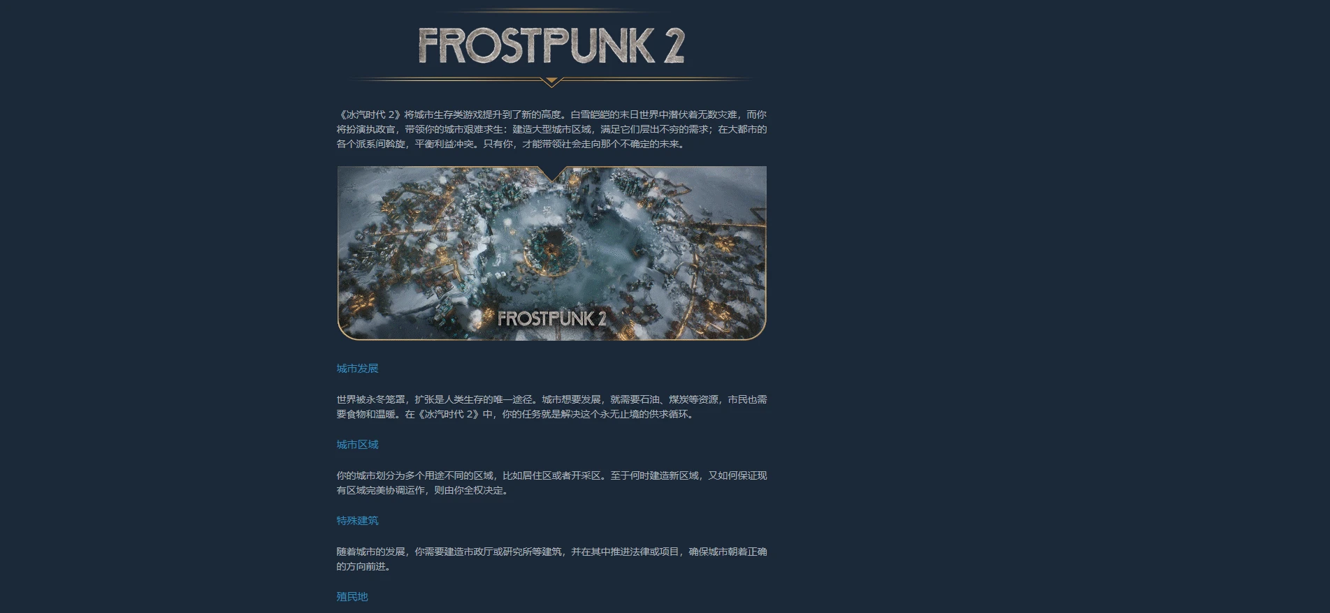 《冰汽时代2》这款游戏的游戏类型就是单机游戏,它没有大型联机系统,玩法都是一个人玩的,玩法就是带领一群人在寒冰末日里面存货下去,世界被永冬笼罩,扩张是人类生存的唯一途径。城市想要发展,就需要石油、煤炭等资源,市民也需要食物和温暖。在《冰汽时代 2》中,你的任务就是解决这个永无止境的供求循环。