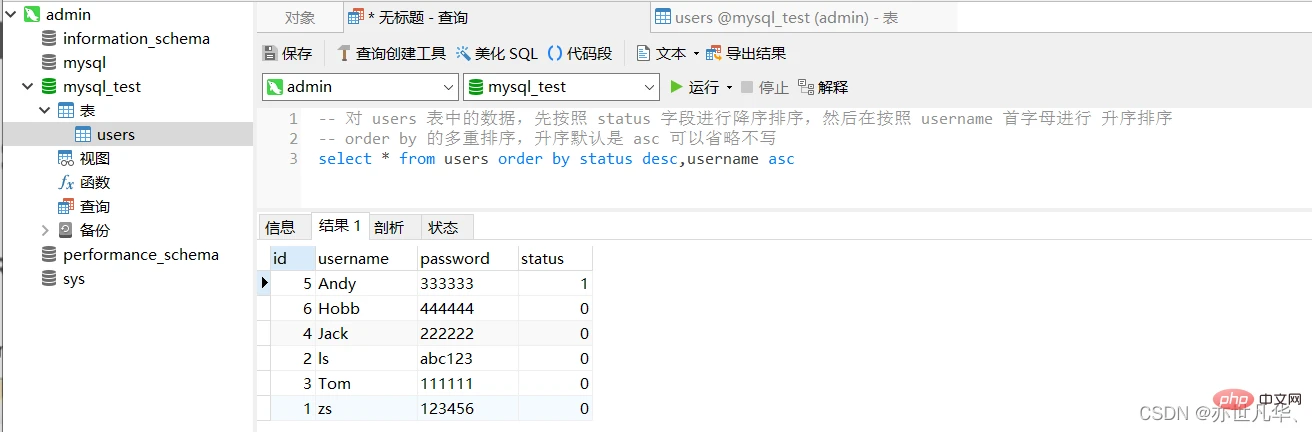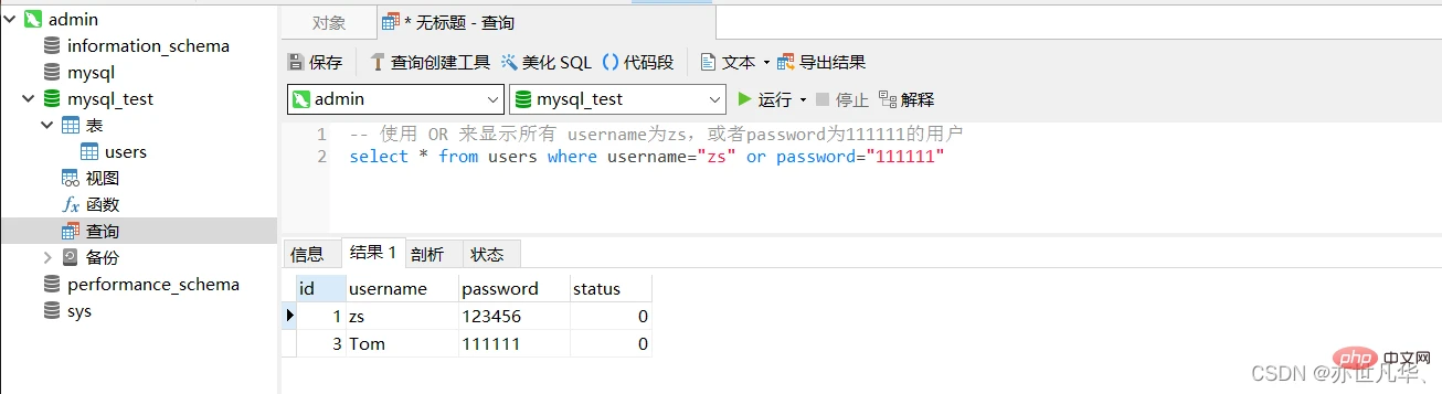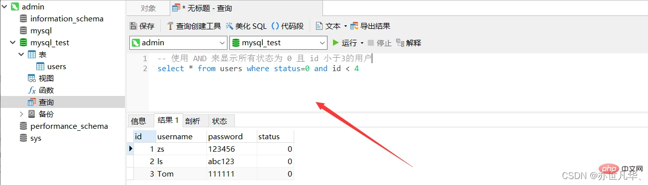 -- 查询 status 为 1 的所有用户 select * from users where status=1 -- 查询 id 大于 2 的所有用户 select * from users where id>2 -- 查询 username 不等于 admin 的所有用户 select * from users where username'admin'