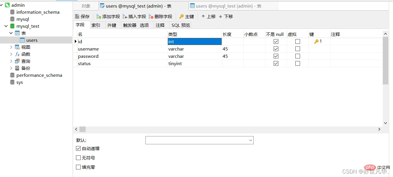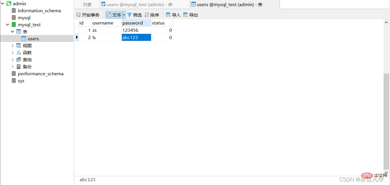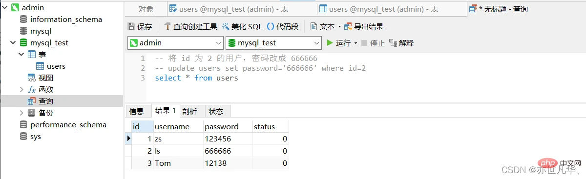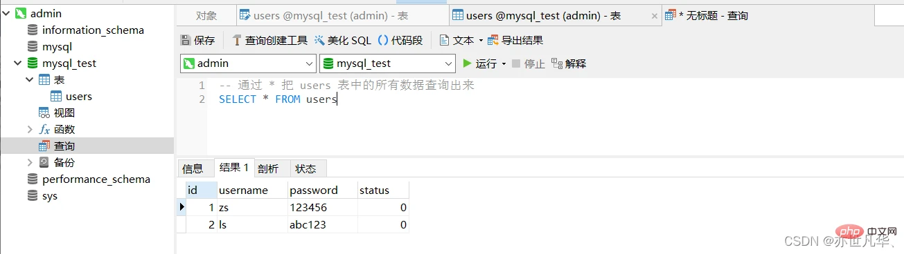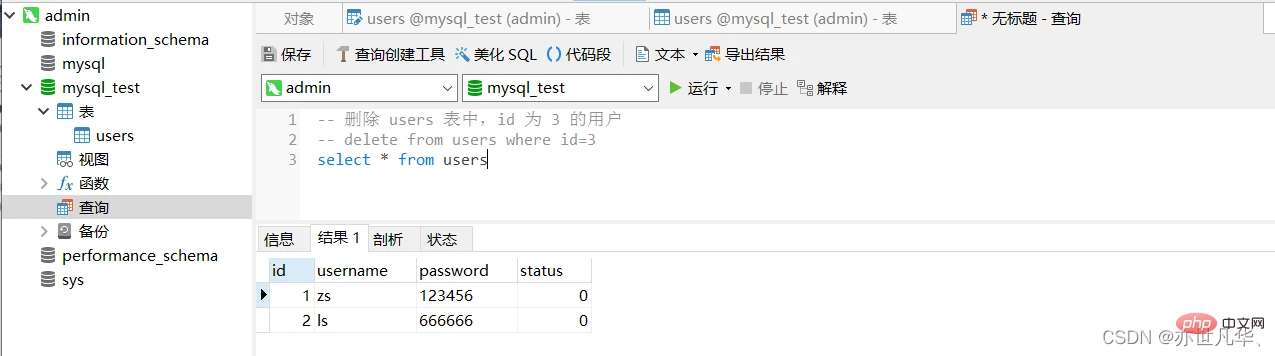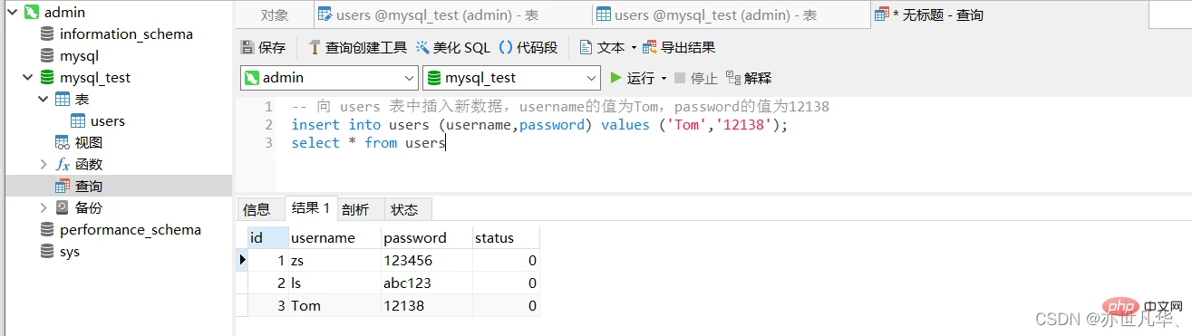 向 users 表中新增数据,其中username为张三,password为123000,代码如下: