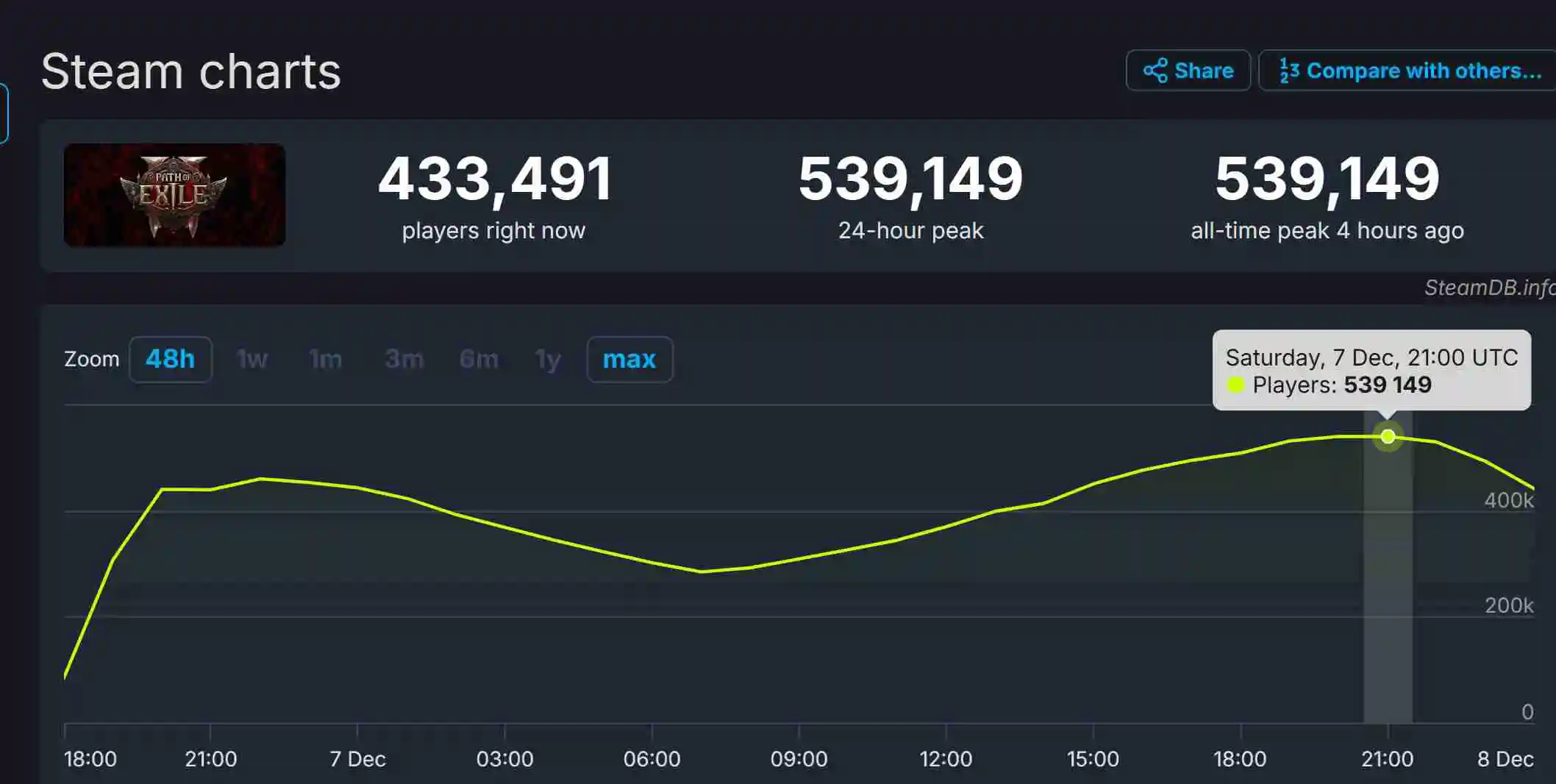 根据SteamDB统计,《流放之路2》Steam在线峰值现已超过了53.9万,接近54万,比首发当天还增加了8万人。