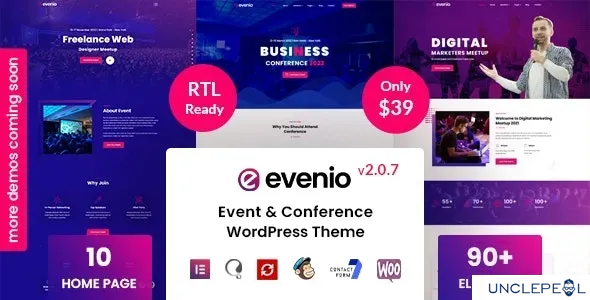 Evenio NULLED – Event & Conference Theme is designed upon modern eye-catching trends & techniques. This theme is perfect for any kind of any Conference, Event, Meetup, Seminar, Exhibition, Meet Up, Congress, Meeting, Business Conference, Event Management websites. It comes with high-quality 10 Prebuild Home Pages (06 Multi + 04 Onepage) and many built-in awesome inner pages such as schedule pages, speaker pages, testimonials pages, multiple blog layouts etc.