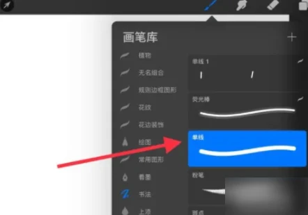打开软件,点击右方笔刷库,然后选择书法--单线。