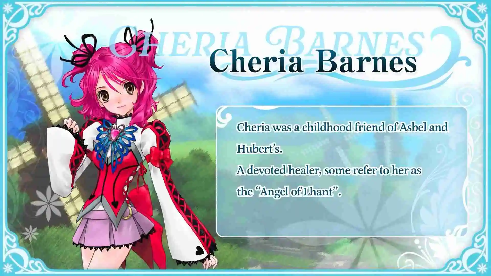 谢莉娅是艾斯贝尔和休伯特儿时好友,作为治疗师,被誉为“兰特的圣女”。