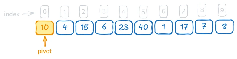 快速排序算法通过一系列比较和交换操作来确定枢轴的正确位置。 让我们以数组 [10, 4, 15, 6, 23, 40, 1, 17, 7, 8] 为例,其中 10 为枢轴: