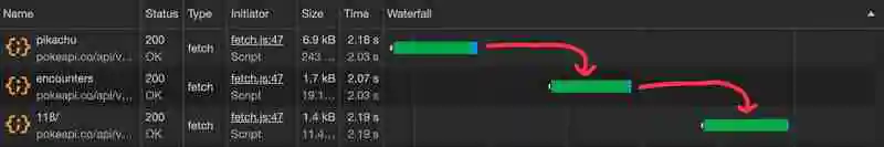 获取瀑布是一种性能问题,发生在多个 API 调用或获取请求串联执行而非并行时。请求被依次排队,导致页面渲染延迟,尤其在获取次数增加时。