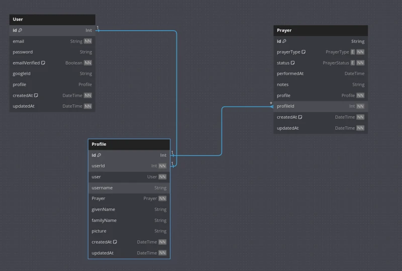 本设计包含用户表(支持密码和Google OAuth登录,目前仅实现密码验证,后续版本将加入Google登录支持)、与用户表一对一关联的个人资料表(存储用户的社交信息),以及祈祷表(包含跟踪和存储用户祈祷信息所需的所有字段)。
