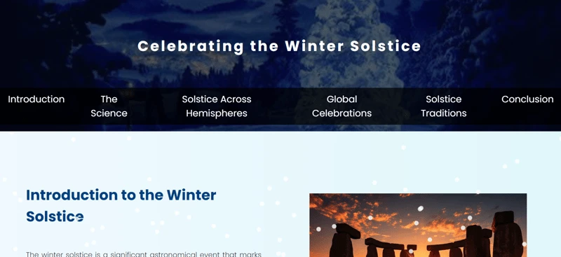 页面设计融入了冬至元素,以纪念这一北半球一年中白天最短、夜晚最长的一天。冬至作为冬季的开始,在许多文化中都有着特殊的意义,此主题也为页面增添了季节感。