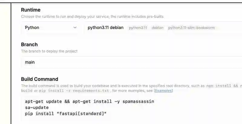 Leapcell是一种理想的解决方案。它允许您部署SpamAssassin等系统软件包,同时保持服务的无服务器特性,按需付费,通常更经济。在Leapcell上部署API非常简单,无需设置环境,只需部署Python镜像并正确填写构建命令即可。