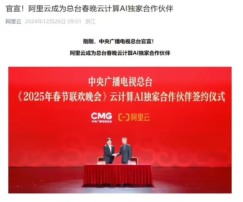 中央广播电视总台正式宣布,阿里云成为2025年春节联欢晚会云计算及人工智能技术的独家合作伙伴,开启春晚历史上首次引入技术合作伙伴的先河,为全球华人观众带来革新的“云上看春晚”体验。
