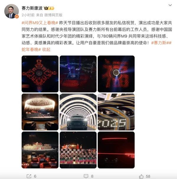 赛力斯集团副总裁康波在社交媒体上表达了对央视导演团队、赛力斯全体工作人员、中国国家艺术体操队和时代少年团的感谢,并表示让用户自豪是品牌建设的最高目标。