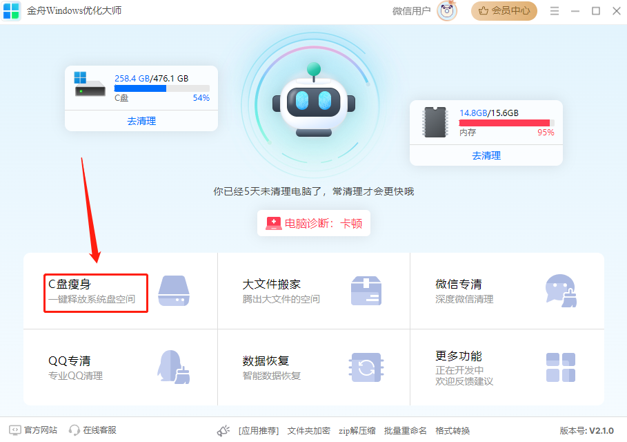 使用金舟Windows优化大师等专业软件,一键扫描并清理系统缓存和垃圾文件,轻松释放C盘空间。