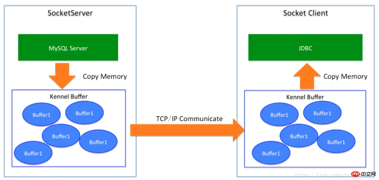 JDBC与数据库之间的通信是通过Socket完成的,因此我们可以把数据库当成一个SocketServer的提供方,因此当SocketServer返回数据的时候(类似于SQL结果集的返回)其流程是:服务端程序数据(数据库) -> 内核Socket Buffer -> 网络 -> 客户端Socket Buffer -> 客户端程序(JDBC所在的JVM内存)
