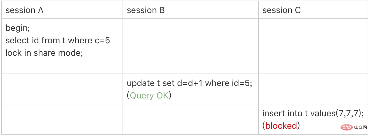 session A 启动事务后执行查询语句加lock in share mode,在索引c上加了next-key lock(5,10] 和间隙锁(10,15);