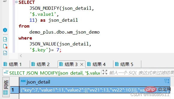 SELECT JSON_MODIFY(json_detail, '$.value1', 11) as json_detail from demo_plus.dbo.wm_json_demo where JSON_VALUE(json_detail, '$.key')= 7;