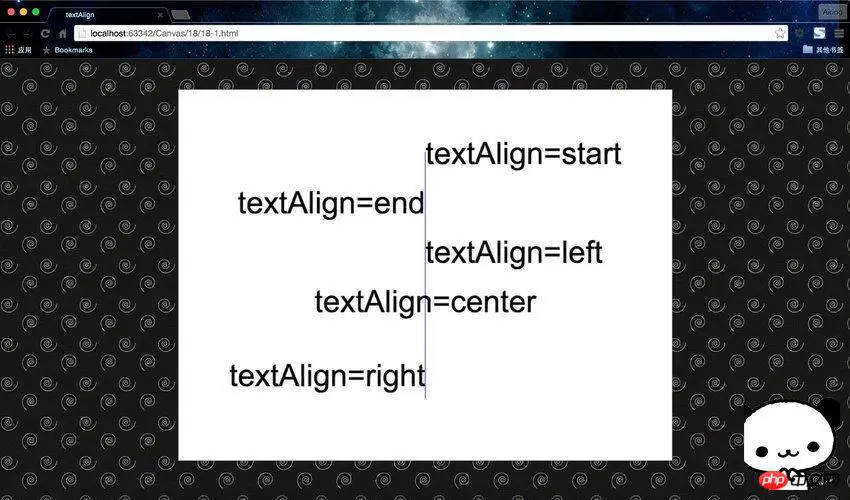 <!DOCTYPE html> <html lang="zh"> <head> <meta charset="UTF-8"> <title>textAlign</title> <style> body { background: url("./images/bg3.jpg") repeat; } #canvas { border: 1px solid #aaaaaa; display: block; margin: 50px auto; } </style> </head> <body> <p id="canvas-warp"> <canvas id="canvas"> 你的浏览器居然不支持Canvas?!赶快换一个吧!! </canvas> </p> <script> window.onload = function(){ var canvas = document.getElementById("canvas"); canvas.width = 800; canvas.height = 600; var context = canvas.getContext("2d"); context.fillStyle = "#FFF"; context.fillRect(0,0,800,600); // 在位置 400 创建蓝线 context.strokeStyle="blue"; context.moveTo(400,100); context.lineTo(400,500); context.stroke(); context.fillStyle = "#000"; context.font="50px Arial"; // 显示不同的 textAlign 值 context.textAlign="start"; context.fillText("textAlign=start", 400, 120); context.textAlign="end"; context.fillText("textAlign=end", 400, 200); context.textAlign="left"; context.fillText("textAlign=left", 400, 280); context.textAlign="center"; context.fillText("textAlign=center", 400, 360); context.textAlign="right"; context.fillText("textAlign=right", 400, 480); }; </script> </body> </html>