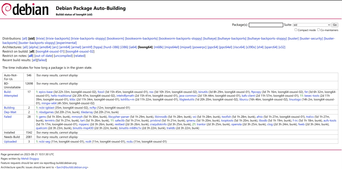 目前,LoongArch已成为Debian Ports归档镜像的最新目标。最初的Debian LoongArch引导程序大约包含了200个软件包,开发人员目前正在进行相关的自托管软件工作。一旦工作达到一定阶段,Debian计划开始在Loongson托管的LoongArch CPU硬件上运行Debian软件包构建