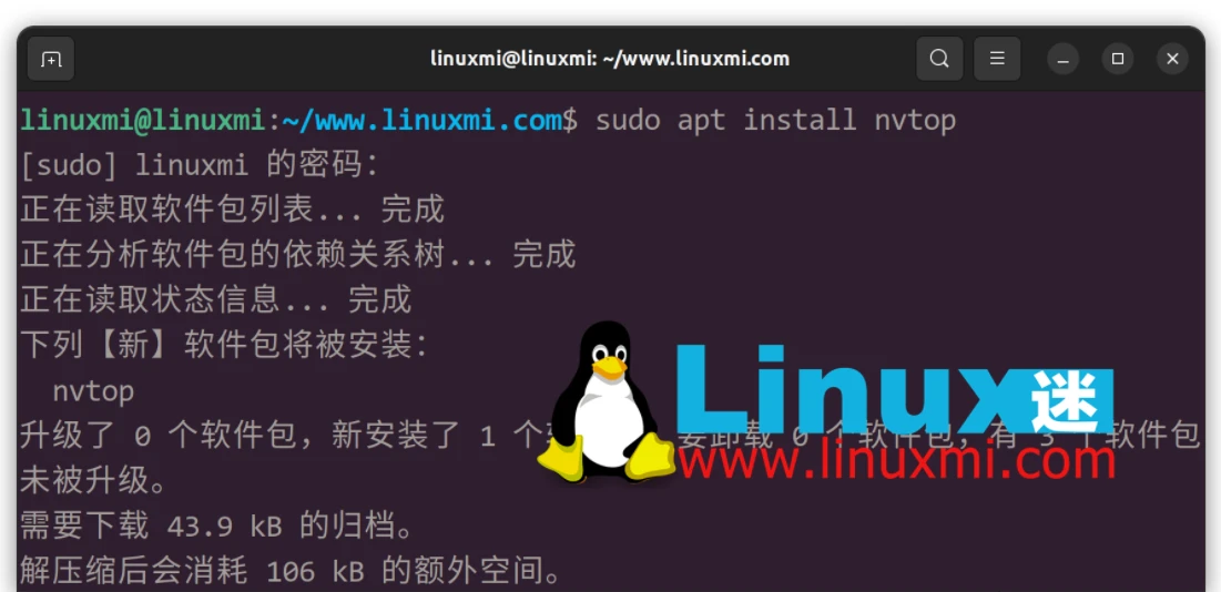 linuxmi@linuxmi:~/www.linuxmi.com$ sudo apt update linuxmi@linuxmi:~/www.linuxmi.com$ sudo apt install nvtop