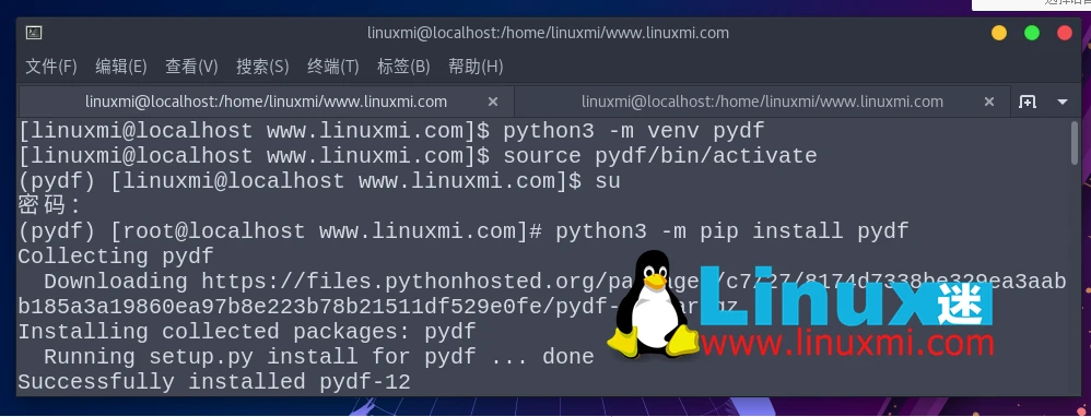 [linuxmi@localhost www.linuxmi.com]$ python3 -m venv pydf [linuxmi@localhost www.linuxmi.com]$ source pydf/bin/activate (pydf) [linuxmi@localhost www.linuxmi.com]$ su 密码: (pydf) [root@localhost www.linuxmi.com]# python3 -m pip install pydf Collecting pydf Downloading https://files.pythonhosted.org/packages/c7/27/8174d7338be329ea3aabb185a3a19860ea97b8e223b78b21511df529e0fe/pydf-12.tar.gz Installing collected packages: pydf Running setup.py install for pydf ... done Successfully installed pydf-12 You are using pip version 9.0.3, however version 23.0.1 is available. You should consider upgrading via the 'pip install --upgrade pip' command. (pydf) [root@localhost www.linuxmi.com]# pip install --upgrade pip