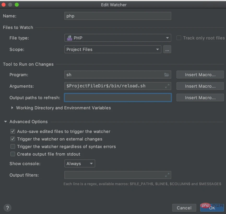 Name: php File Type: PHP Scope: Project Files Program: sh Arguments: $ProjectFileDir$/bin/reload.sh Show Console: Always