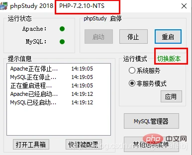 2、查看dvwa页面你会发现此时默认的php 版本过低,所以需要切换下php版本,打开phpstudy直接点击切换即可(切换到7.2版本)