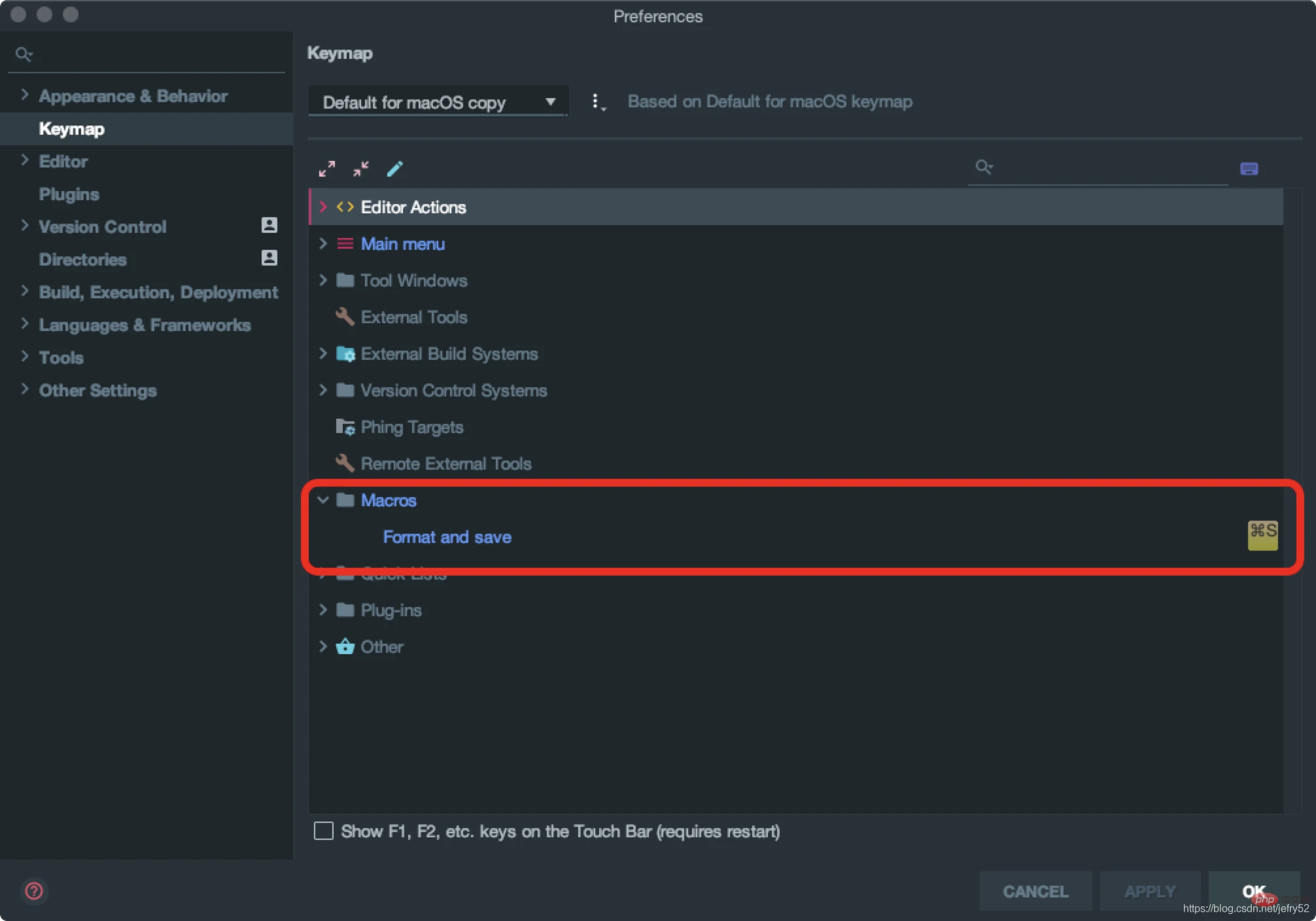 在File->Settings(设置)->Keymap->Macros,找到刚才添加的“Format And Save”,右键点击“add keyboard shortcut”,录入快捷键“Ctrl+S”,点击”OK”。