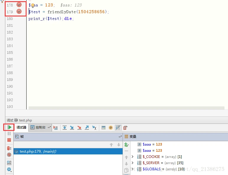 3、再一次刷新你在浏览器中打开的页面,然后看看你的phpstorm编辑器。左侧断点的红色圆圈,变成了圈中有一个对勾,那么代表你进入了断点。如下图