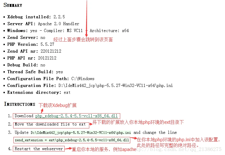将phpinfo();的信息全部输入网址:http://xdebug.org/wizard.php中的框,得到适配的xdebug版本,按照下图中操作进行。