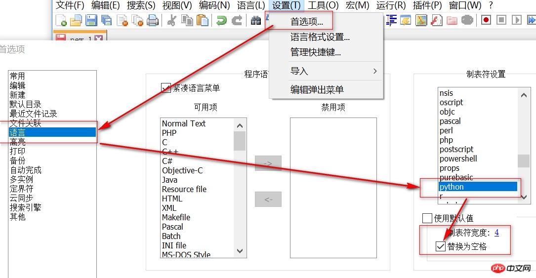 Notepad++ ->”设置”菜单->”首选项”按钮->”语言”按钮