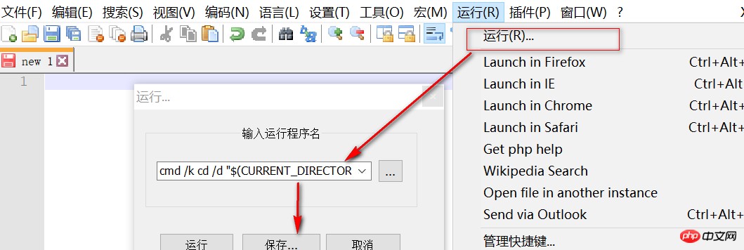 Notepad++ ->”运行”菜单->”运行”按钮