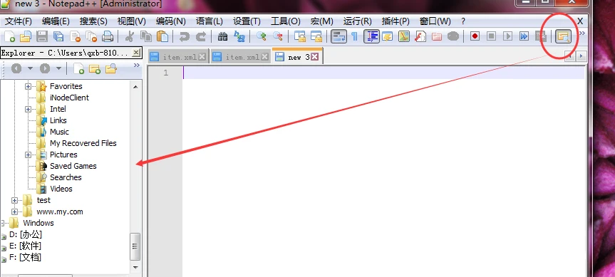 6、重新打开notepad++工具。在上面的菜单中就可以点击Exployer按钮展开文件目录结构。