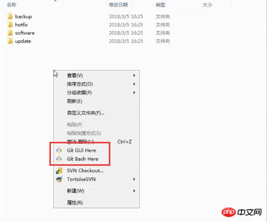 下面我们可以随便打开一个文件夹目录,点击鼠标右键。出现下图中所示的Git GUI Here(Git的一个图文用户界面)和Git Bash Here(Git命令行界面)。