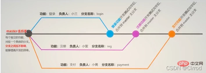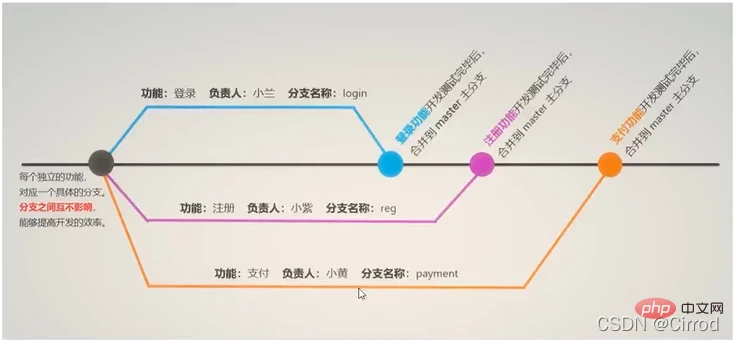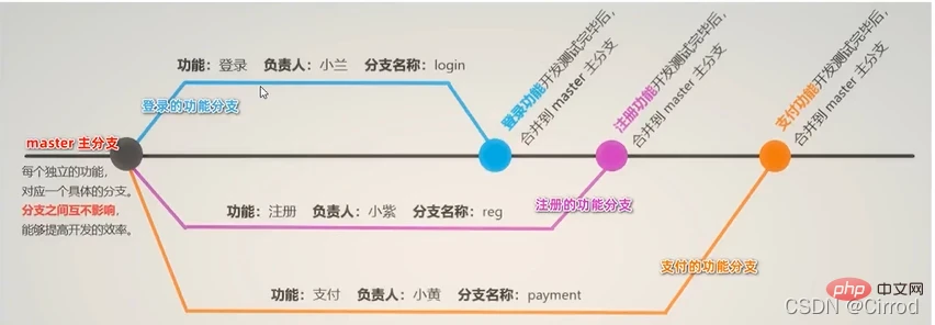 在进行多人协作开发的时候,为了防止互相干扰,提高协同开发的体验,建议每个开发者都基于分支进行项目功能的开发,例如: