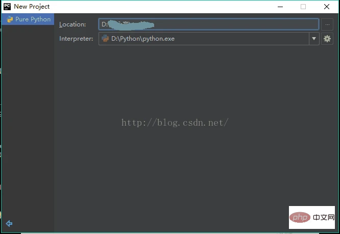 5、点击Create New Project,进入如下图的界面,图中的interpreter是选择你安装的python,Location可以自定义项目存放目录,选择好后,点击create。