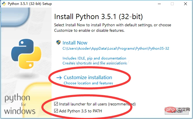 3、双击exe文件进行安装,如下图,并按照圈中区域进行设置,切记要勾选打钩的框,然后再点击Customize installation进入到下一步: