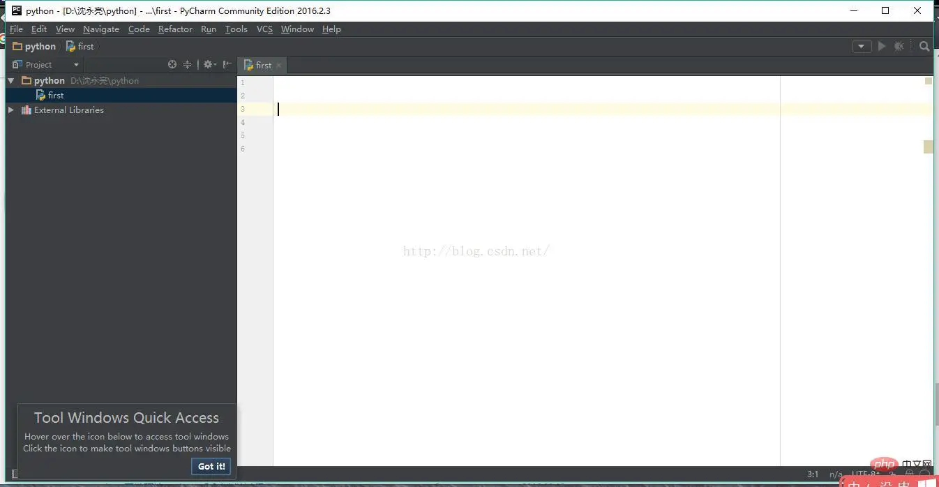 1、单击桌面上的pycharm图标,进入到pycharm中,如下图所示: