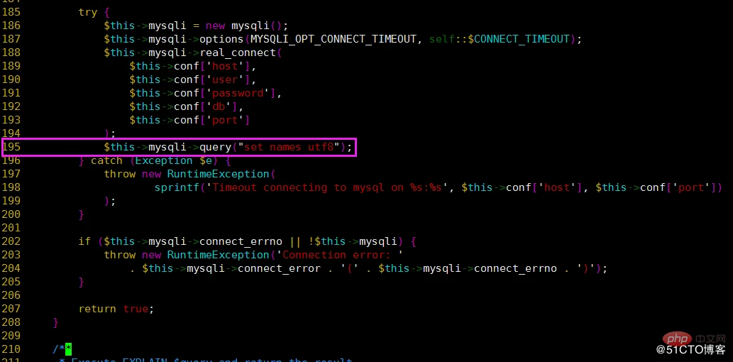 新增(194行后增加),$this->mysqli->query("set names utf8");