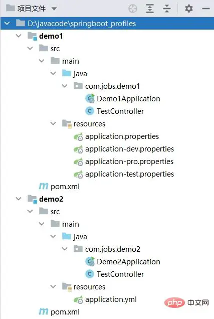Demo1 通过多个 properties 文件来实现,Demo2 通过单个 yml 文件来实现,搭建结果如下所示: