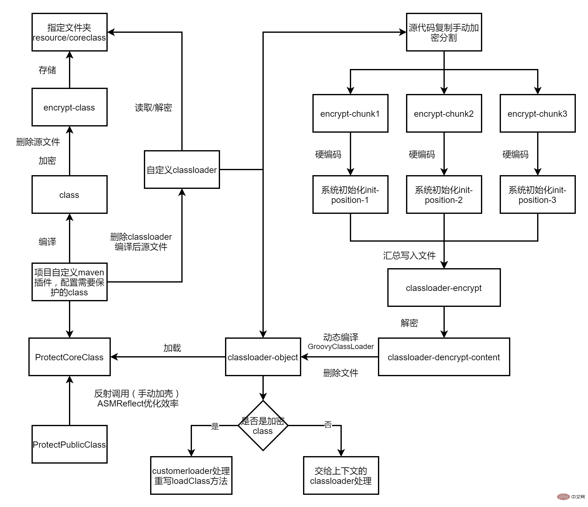 最近针对公司框架进行关键业务代码进行加密处理,防止通过jd-gui等反编译工具能够轻松还原工程代码,相关混淆方案配置使用比较复杂且针对springboot项目问题较多,所以针对class文件加密再通过自定义的classloder进行解密加载,此方案并不是绝对安全,只是加大反编译的困难程度,防君子不防小人,整体加密保护流程图如下图所示