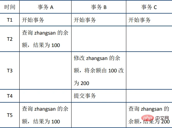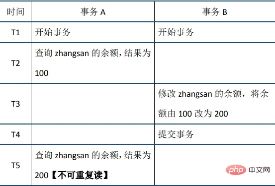 (2)不可重复读:在事务A中先后两次读取同一个数据,两次读取的结果不一样,这种现象称为不可重复读。脏读与不可重复读的区别在于:前者读到的是其他事务未提交的数据,后者读到的是其他事务已提交的数据。举例如下: