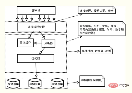 (2)第二层:服务器层,负责查询语句的解析、优化、缓存以及内置函数的实现、存储过程等。