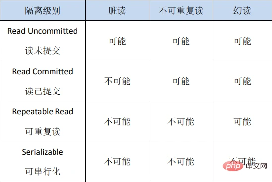 SQL标准中定义了四种隔离级别,并规定了每种隔离级别下上述几个问题是否存在。一般来说,隔离级别越低,系统开销越低,可支持的并发越高,但隔离性也越差。隔离级别与读问题的关系如下: