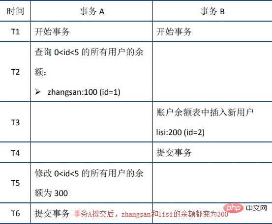 (3)幻读:在事务A中按照某个条件先后两次查询数据库,两次查询结果的条数不同,这种现象称为幻读。不可重复读与幻读的区别可以通俗的理解为:前者是数据变了,后者是数据的行数变了。举例如下: