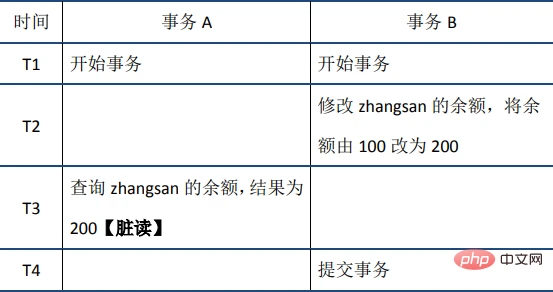 (1)脏读:当前事务(A)中可以读到其他事务(B)未提交的数据(脏数据),这种现象是脏读。举例如下(以账户余额表为例):
