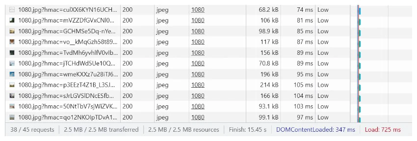 即使您没有滚动超过上面演示中的第一个图像,您也会看到浏览器已加载所有图像。以下浏览器开发人员工具中网络选项卡的屏幕截图显示发出了 38 个请求,传输了大约 2.5MB 的数据。浏览器总共下载了 19 个图像,重定向使请求数量增加了一倍。