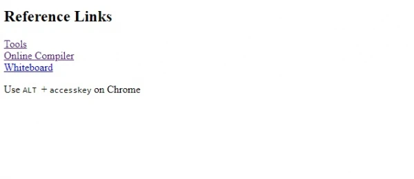 <!DOCTYPE html> <html> <body> <h2>Reference Links</h2> <a href="https://www.tutorialspoint.com/online_dev_tools.htm" accesskey="t">Tools</a><br> <a href="https://www.tutorialspoint.com/codingground.htm" accesskey="c">Online Compiler</a><br> <a href="https://www.tutorialspoint.com/whiteboard.htm" accesskey="w">Whiteboard</a><br> <p>Use <kbd>ALT </kbd> + <kbd>accesskey</kbd> on Chrome</p> </body> </html>